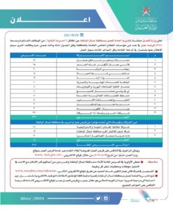 الوصال - أعلنت وزارة العمل ممثلة بالمديرية العامة للعمل بشمال الباطنة عن إطلاق الحزمة الثانية من الوظائف الشاغرة وعددها 327 فرصة عمل في عدد من مؤسسات القطاع الخاص العاملة بالمحافظة وفق الجدول أدناه.
