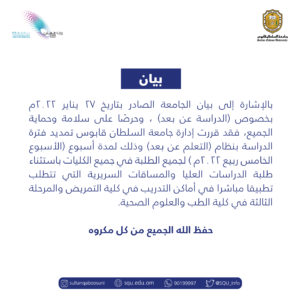 الوصال - قررت إدارة جامعة السلطان قابوس تمديد فترة الدراسة بنظام (التعلم عن بعد) وذلك لمدة أسبوع (الأسبوع الخامس ربيع 2022م) لجميع الطلبة في جميع الكليات باستثناء طلبة الدراسات العليا والمساقات السريرية التي تتطلب تطبيقا مباشرا في أماكن التدريب في كلية التمريض والمرحلة الثالثة في كلية الطب والعلوم الصحية.