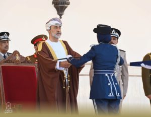 وعند اعتلاء جلالتِه المقصورة السُّلطانية أدّت طوابير الخريجين التحيّة العسكريّة لجلالةِ السُّلطان القائد الأعلى - حفظه الله ورعاه– ثم عزفت موسيقى شرطة عُمان السُّلطانية السّلام السُّلطاني.