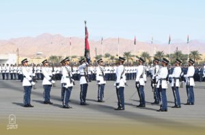 عقب ذلك تقدم قائد طابور الخريجين إلى المقصورة السُّلطانية مستأذنًا جلالةَ القائد الأعلى - حفظه الله ورعاه - ببدء فعاليات العرض العسكري، حيث قدّم الخريجون استعراضهم العسكري بالمسير البطيء مرورًا من أمام المقصورة السُّلطانية مؤدين التحيّة العسكريّة لجلالةِ القائد الأعلى - حفظه الله ورعاه -، ثم تقدّم أوائل الخريجين لاستلام سيف الشرف من حضرةِ صاحبِ الجلالةِ السُّلطان هيثم بن طارق المعظم القائد الأعلى - حفظه الله ورعاه - .