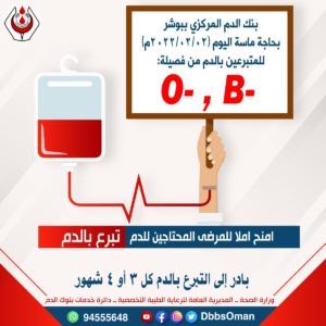 الصفحة الرئيسيةالأخبارمناشدة عاجلة للتبرع بالدم مناشدة عاجلة للتبرع بالدم 02 فبراير 2022 الوصال – ناشد بنك الدم المركزي ببوشر مناشدة عاجلة للمتبرعين بالدم من فصيلة أو سالب و بي سالب O - و B+ وذلك نظرًا للحاجة الماسة لدم اليوم.