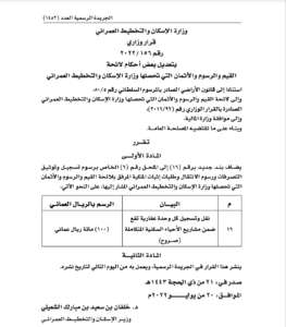 الوصال - أصدر معالي الدكتور خلفان بن سعيد الشعيلي وزير الإسكان والتخطيط العمراني قرارًا وزاريًا بإضافة بند (نقل وتسجيل كل وحدة عقارية تقع ضمن مشاريع الأحياء السكنية المتكاملة صروح برسم قيمته ١٠٠ ريال عماني ) إلى لائحة القيم والرسوم والأثمان التي تحصلها الوزارة .