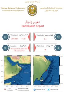 الوصال- رصد مركز رصد الزلازل بجامعة السلطان قابوس اليوم زلزال في صدع مصيرة بولاية جعلان بني بو علي الساعة 11:23 صباحًا بقوة 3.4 ريختر يبعد عن ولاية صور 125 كم وبعمق 10كم.