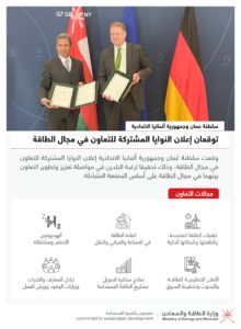 الوصال - في اطار الزيارة الرسمية لحضرة صاحبِ الجلالة السلطان هيثم بن طارق المعظّم لجمهورية ألمانيا الاتحادية، وقع معالي المهندس سالم بن ناصر العوفي وزير الطاقة والمعادن، ومعالي الدكتور باتريك جرايشن وزير الدولة بوزارة الاقتصاد وحماية المناخ، إعلان النوايا المشتركة للتعاون في مجال الطاقة.
