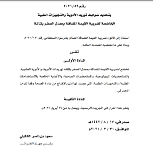 تحديد ضوابط توريد الأدوية والتجهيزات الطبية الخاضعة لضريبة القيمـة المضافة بمعدل الصفر بالمئة