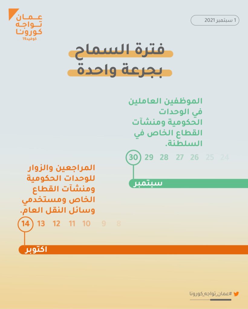 الوصال- أوضح حساب عمان تواجه كورونا أن فترة السماح للموظفين العاملين بالوحدات الحكومية ومنشآت القطاع الخاص المطعمين بجرعة واحدة لدخول المنشآت تمتد حتى 30 سبتمبر الجاري، أما بالنسبة للمراجعين وزوار الوحدات الحكومية ومنشآت القطاع الخاص ومستخدمي النقل العام تمتد حتى 14 أكتوبر.