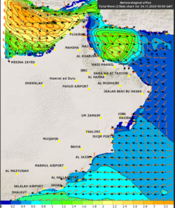 الوصال - نبهت الأرصاد العمانية بأن حالة البحر ستكون خلال اليومين القادمين ابتداًء من اليوم متوسط إلى هائج الموج (3 أمتار) على سواحل محافظة مسندم ومتوسط الموج على سواحل بحر عمان (2.5 متر) .