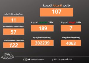 كما سجلت الوزارة 107 حالة إصابة وتعافي 189 حالة، وبلغ عدد الحالات المنومة خلال الـ 24 ساعة الماضية 11 فيما بلغ عدد الحالات المنومة المؤسسات الصحية 122 ووصل العدد في العناية المركزة إلى 57.