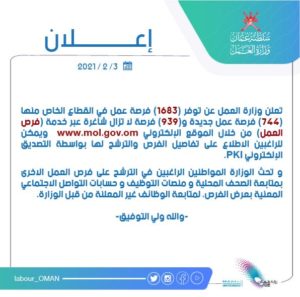 الوصال - أعلنت وزارة العمل عن توفر (1683) فرصة عمل في القطاع الخاص منها (744) فرصة عمل جديدة و(939) فرصة لا تزال شاغرة عبر خدمة (فرص العمل) من خلال الموقع الإلكتروني mol.gov.om ويمكن للراغبين الاطلاع على تفاصيل الفرص والترشح لها بواسطة التصديق الإلكتروني PKI