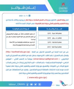 الوصال – أعلنت وزارة العمل ممثلة في مكتب العمل المشترك بدولة قطر عن توفر وظائف شاغرة لدى وزارة التعليم والتعليم العالي بدولة قطر الشقيقة حسب البيانات المحددة أدناه.