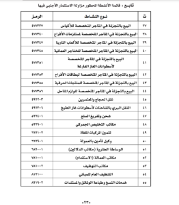 الوصال – أصدر معالي قيس بن محمد اليوسف وزير التجارة والصناعة وترويج  الاستثمار قرًار وزاريًا بتحديد الأنشطة المحظور فيها الاستثمار الأجنبي، حيث حدد القرار70 نشاطًا منها خياطة الملابس ومحطات بيع الوقود نقل الحجاج والمعتمرين وغيرها من الأنشطة يمكن الاطلاع عليهاً عبر المرفق التالي: