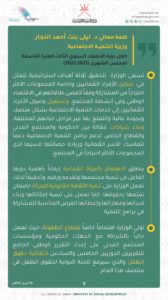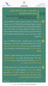 وبشأن الأشخاص ذوي الإعاقة ذكرت وزيرة التنمية الاجتماعية أن الوزارة حريصة على تذليل وتقديم الدعم والخدمات لذوي الإعاقة وفق التطور التقني سيتم توفير خدمات جديدة لهذه الفئة، وفق توافر الوفورات المالية والكوادر المختصة بالتأهيل.