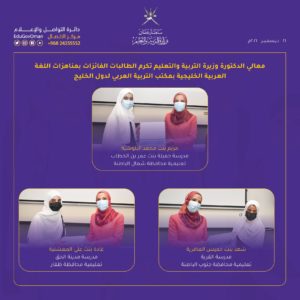 كما كرمت الطالبات الفائزات بمناهزات اللغة العربية الخليجية بمكتب التربية العربي لدول الخليج وهن: الطالبة مريم بنت محمد البلوشية من مدرسة جميلة بنت عمر بن الخطاب من تعليمية محافظة شمال الباطنة وحصلت على الميدالية الذهبية، وحصلت الطالبة شهد بنت خميس الغافرية من مدرسة القرية بمحافظة جنوب الباطنة على الميدالية الفضية، فيما نالت الطالبة غادة بنت علي المعشنية من مدرسة الحق بمحافظة ظفار على الميدالية البرونزية.