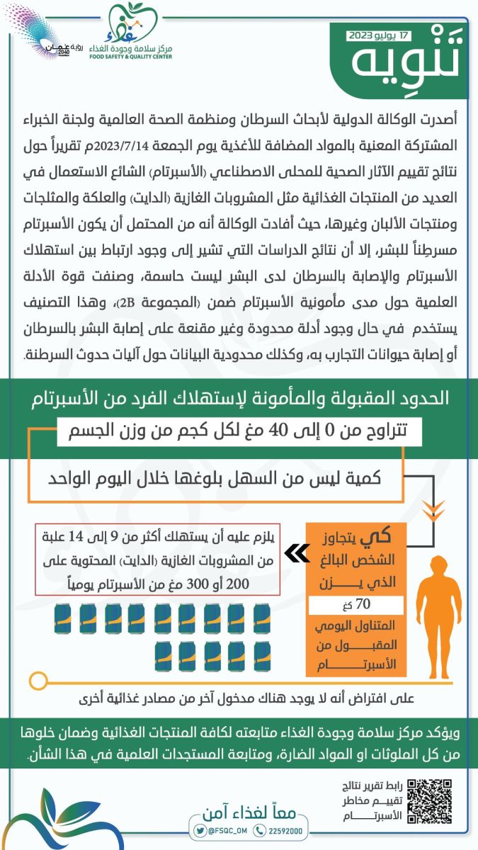 الوصال - نوه ه مركز سلامة وجودة الغذاء أن الوكالة الدولية لأبحاث السرطان ومنظمة الصحة العالمية أفادت أن نتائج دراسات تقيم الآثار الصحية لمادة الأسبرتام التي تستعمل في المشروبات الغازية (الدايت) والمثلجات والعلكة ومنتجات الألبان تشير إلى وجود ارتباط بين استهلاكه والإصابة بالسرطان لدى البشر ليست حاسمة، وصنفت قوة الأدلة حول مأمونيته ضمن المجموعة B وهو تصنيف يستخدم في حالة وجود أدلة محدودة وغير مقنعة، وأكد المركز أنه يتابع المستجدات العلمية في هذا الشأن.